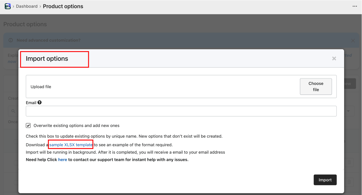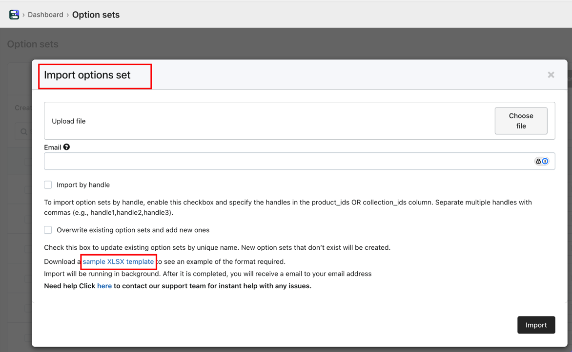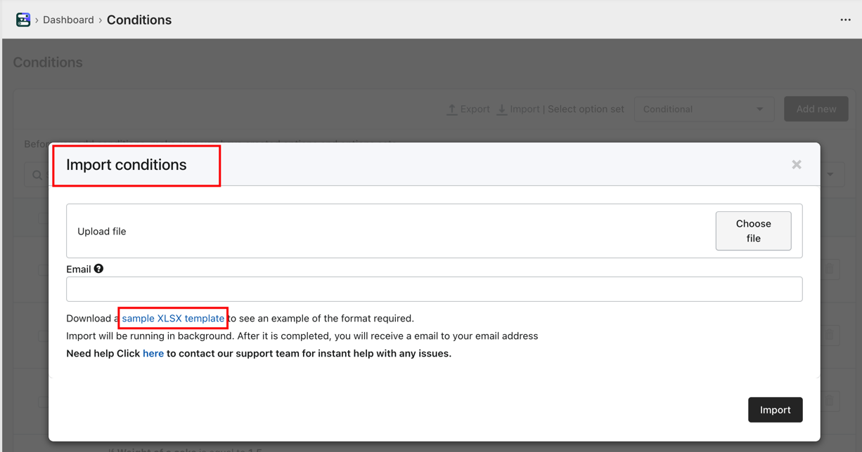 Yes, the app allows you to import and export Options, Option Sets (available on the Advanced plan), and Conditions (available on the Enterprise plan). Sample files are provided for each import type to help you identify required fields and correctly format your data before uploading.