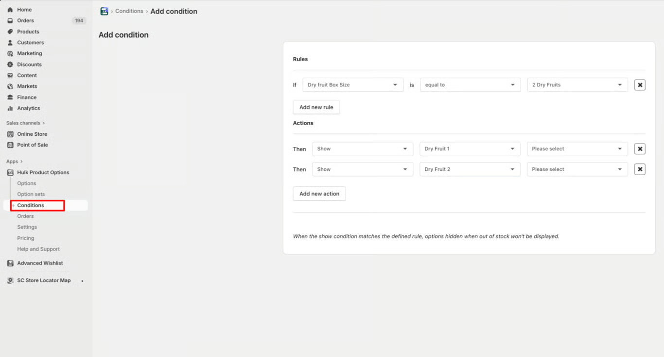 Navigate to the Conditions tab, select the option set for which you need to define conditions, and create a set of Rules and Actions.