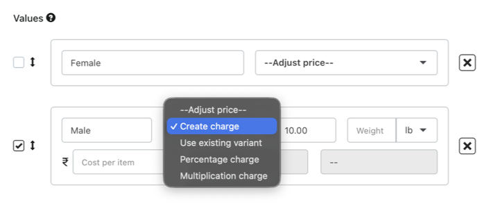 Once you create a value for an option, click on the “Adjust price” dropdown next to the value. It will give you the following options: