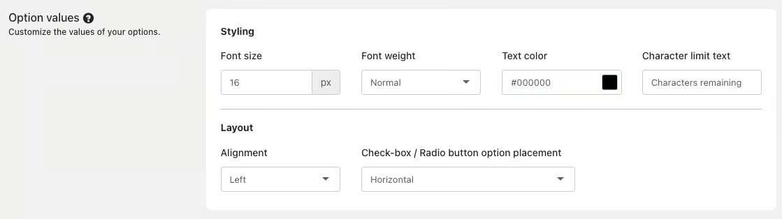 5. Option Values – Customize the display and appearance of your option values, including text styling, alignment, and layout.