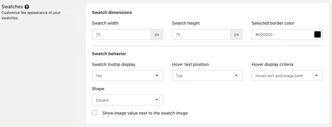 Show Image Value Next to the Swatch Image: Enable or disable displaying the image value next to the swatch.