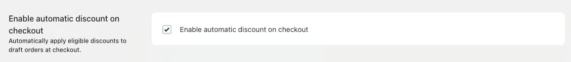 4. Enable automatic discount on checkout: Enable automatically apply eligible discounts to draft orders at checkout.