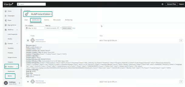 (3) As soon as the customer places an order, their contact details will be fetched in your Klaviyo Analytics Data. Along with their purchase details, you can find them in Klaviyo Analytics > Metrics > HulkProductoption section