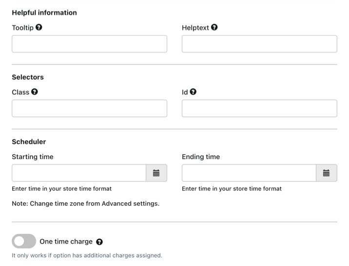 Sets the date/time when the option becomes inactive or hidden from customers.Note: The time zone follows your store’s time format, which can be changed in Advanced Settings.