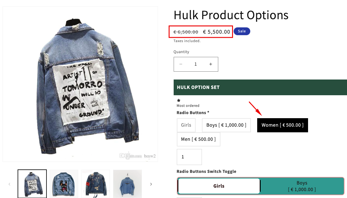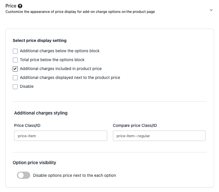 To add the selected charged option price to the product’s base or compare price on the product page, go to Settings → Display Settings → Price and enable “Additional charges included in product price.”