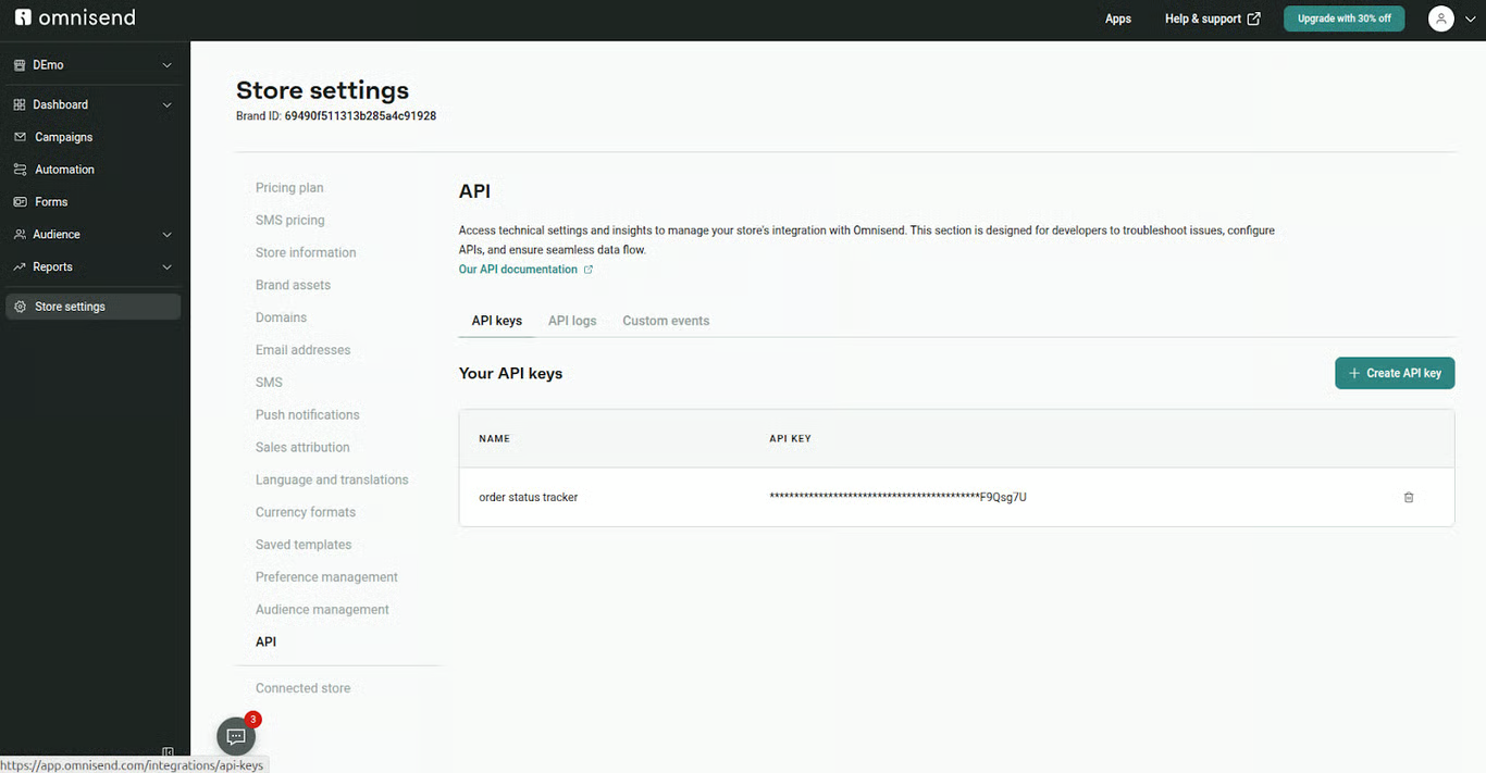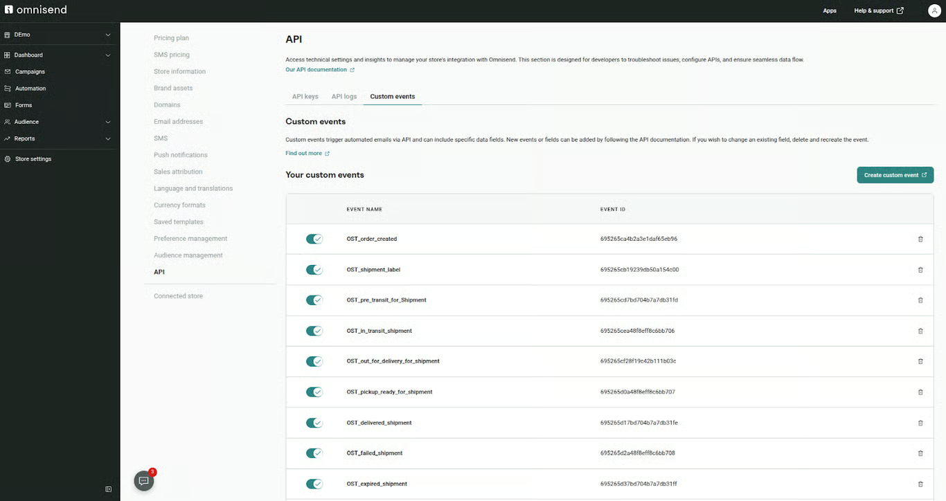 - Back to Omnisend admin > Store settings > API > Custom Events