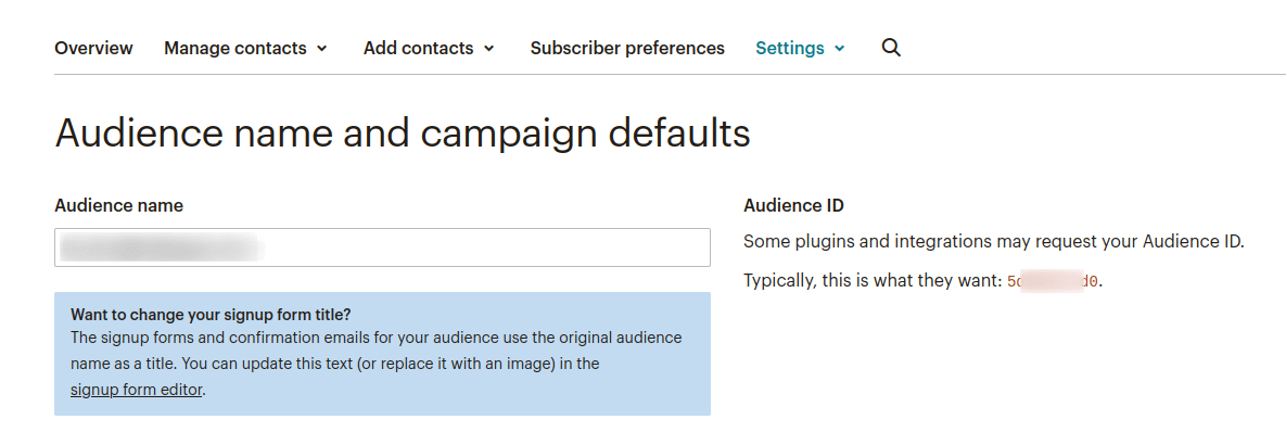 - Navigate to Audience > All contacts > settings > Audience name and defaults