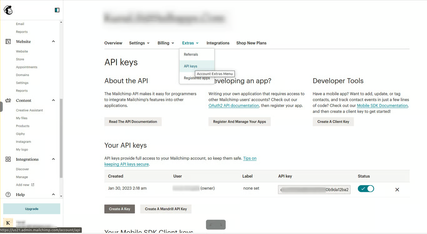- To locate the API Keys, log into your Mailchimp account.