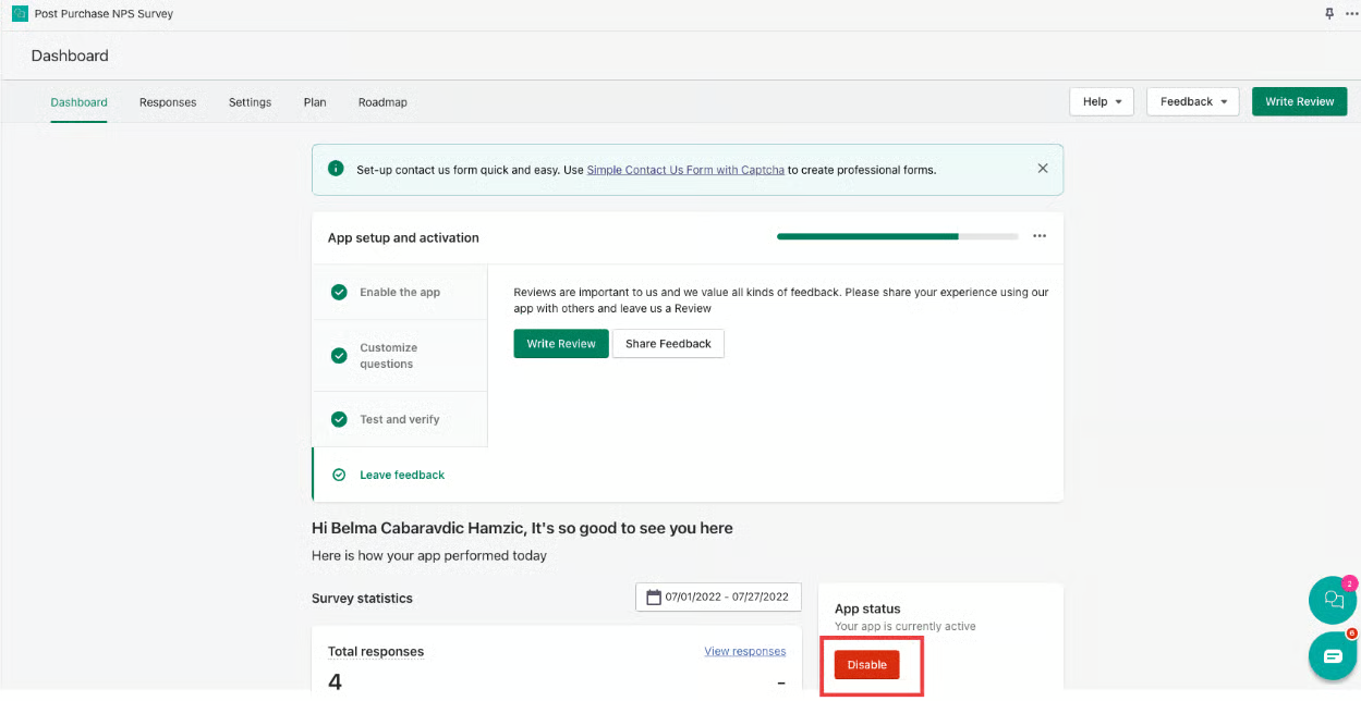 In the application general settings, there is an 'Add New' button to add a question in the survey form, as shown here. Here, you can add new questions, edit the existing ones, define the form title and the success message. Additionally, you can see the Survey preview if you click on the "Preview" button, right below your survey questions in the general settings section.