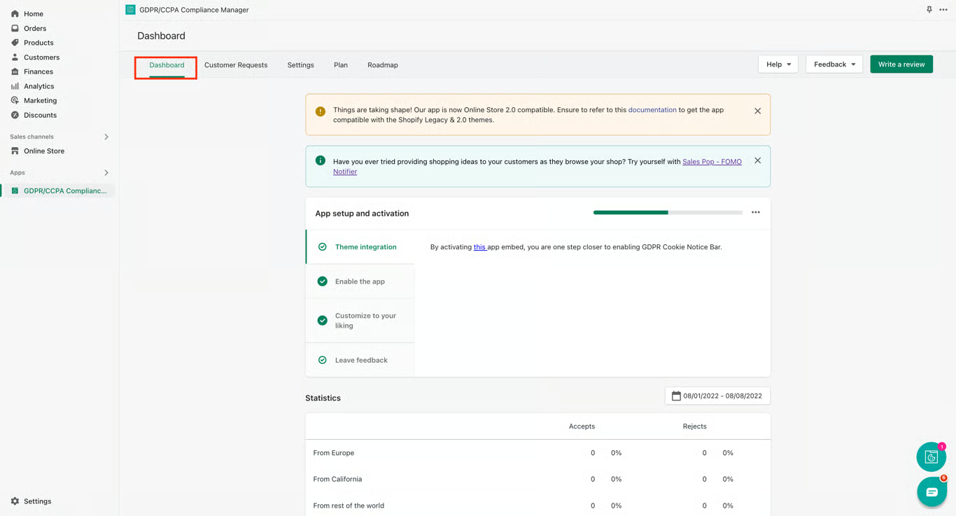 A simplified dashboard which provides statistics of Cookie Consent Bar.