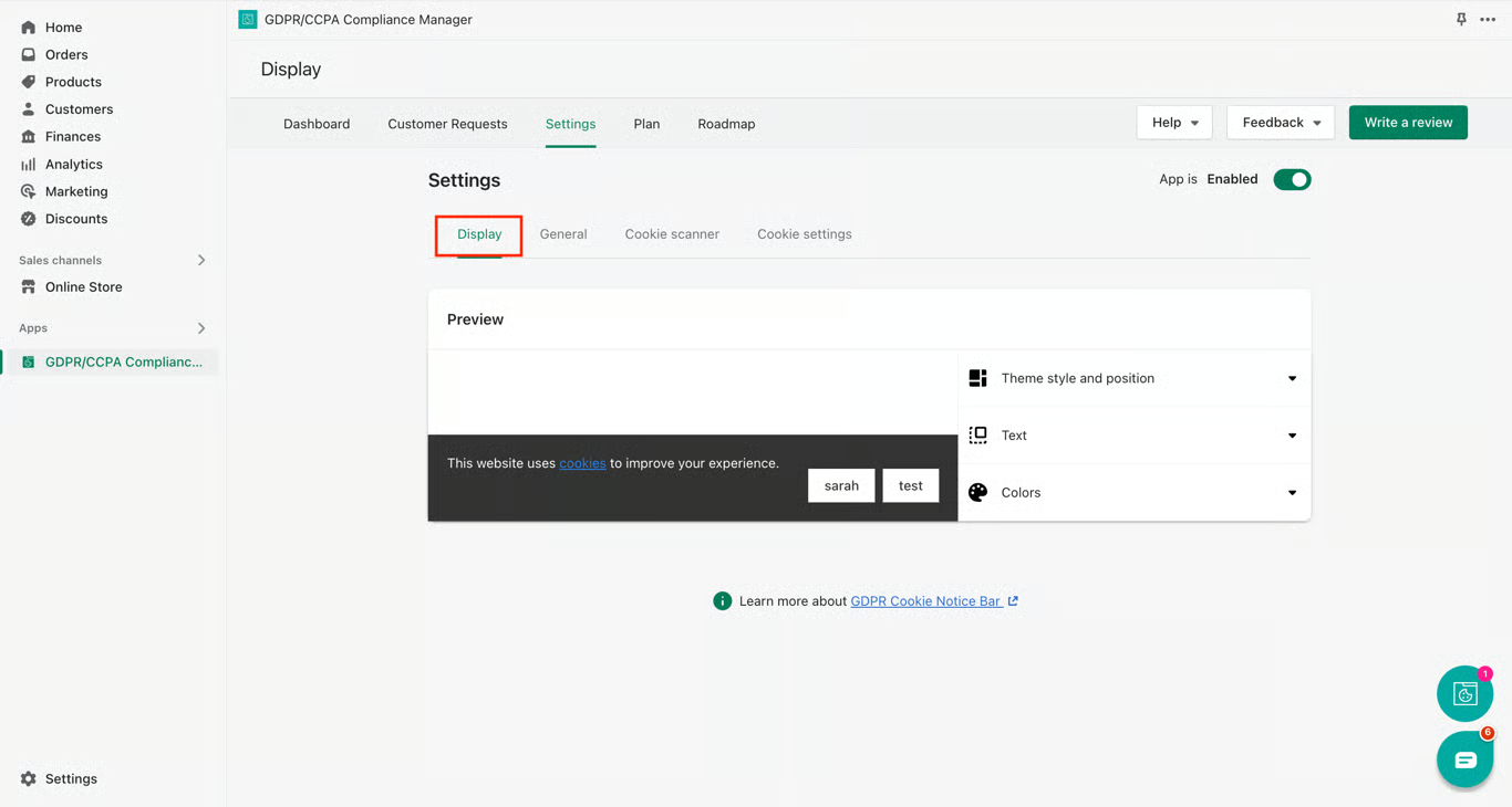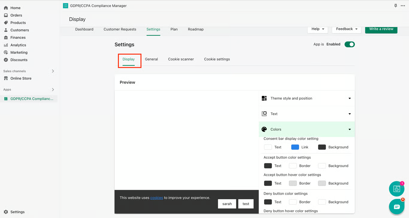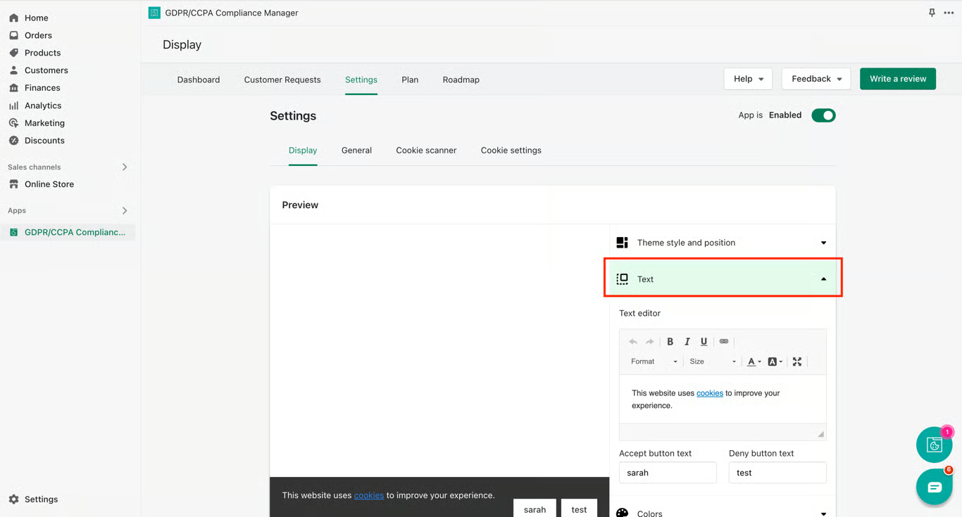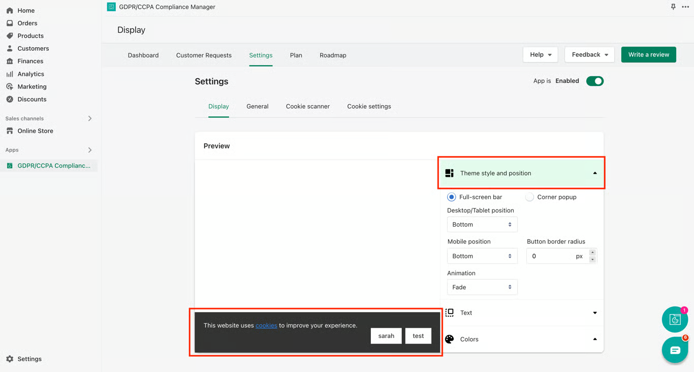 Configure the look and feel of the Consent Bar with the customization options. Users have the ability to modify the main text and customize the colour of the Cookie Consent Bar and Buttons. Users can also select the position of the bar on Desktop and Mobile devices.