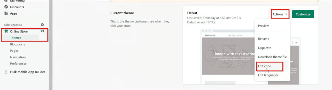 Now navigate to the “Online Store” menu and look for the edit code option under the ‘Action’ dropdown option.