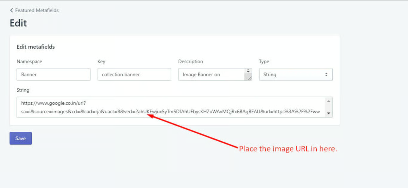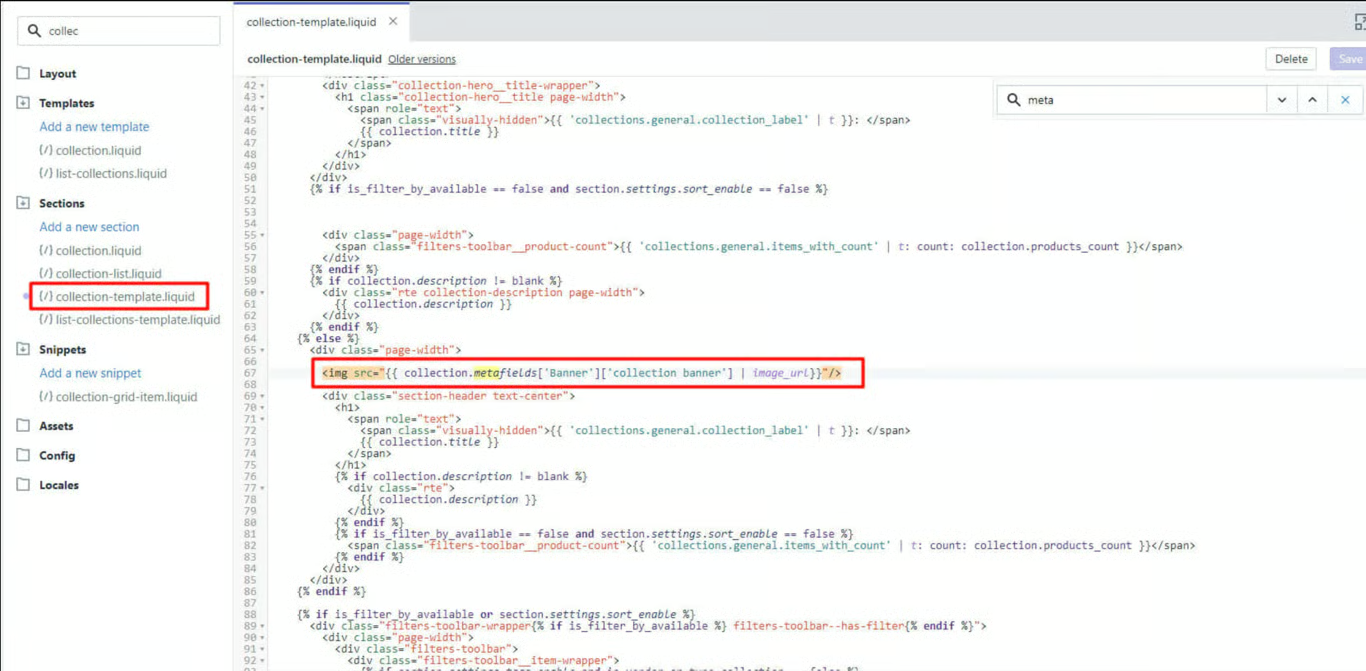 Now under the ‘collection.liquid’ or ‘collection-template.liquid’ file of the Shopify store theme, place the code where ever the metafield needs to be displayed. In this example, the code is placed above the product description. Save the file.