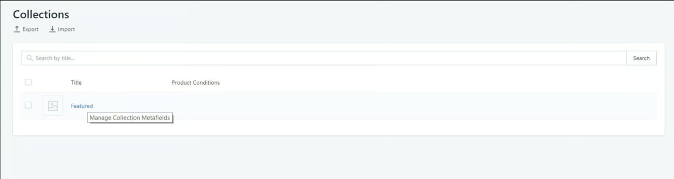 In this tutorial, a banner is displayed on the collections page of the Shopify store. To start, navigate to the Master Metafield application, and in Collection look for the collection to add metafield for. In this example, a collection is chosen to display the banner on it.