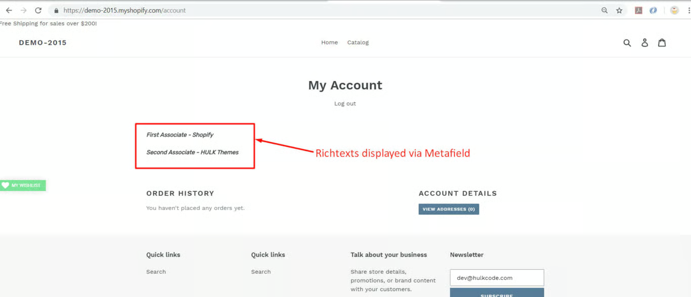 Now under the ‘customer/account.liquid’ file of the Shopify store theme, Place the code where ever the metafield is meant to be displayed. In this example, the code is placed below the log-out button. Save the file.