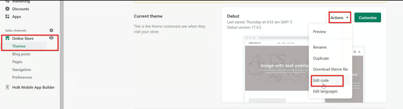 Now navigate to Shopify's “Online Store” menu and look for the edit code option under the ‘Action’ dropdown option.