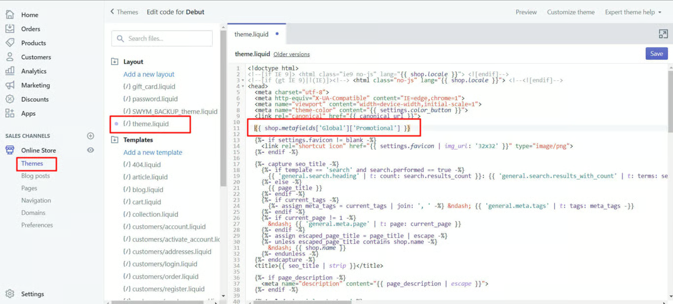 Now under the ‘product.liquid’ or ‘product-template.liquid’ file of the Shopify store theme, place the code where ever it requires the metafield to be displayed. In this example, the code is placed above the product description. Save the file.
