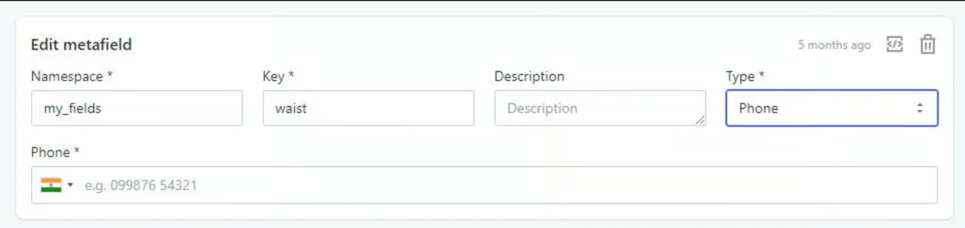 - Type: Select the type of metafield as Phone