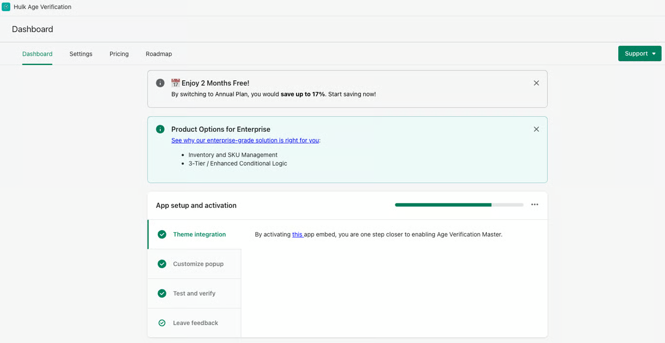 1. On the Dashboard, and Theme integration, click the link: "by activating this app"