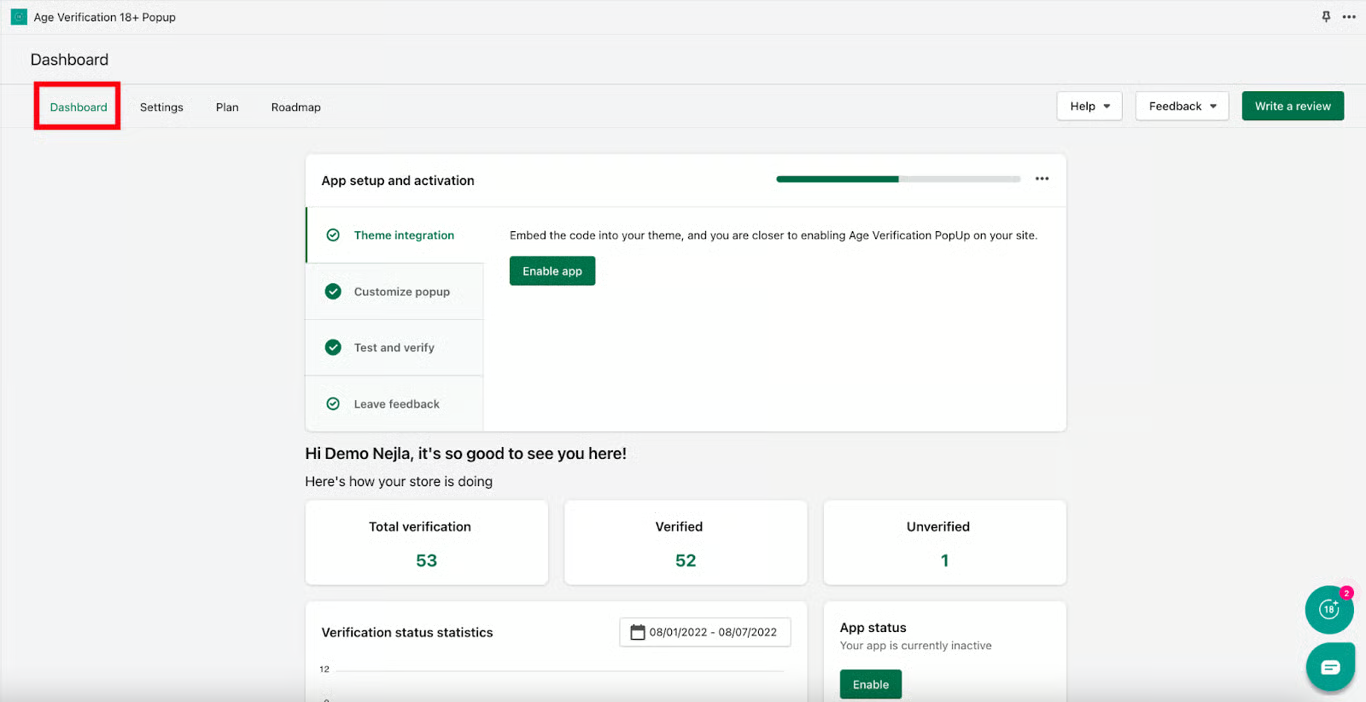 A simplified dashboard that provides statistics of the app and easy access to Popup settings