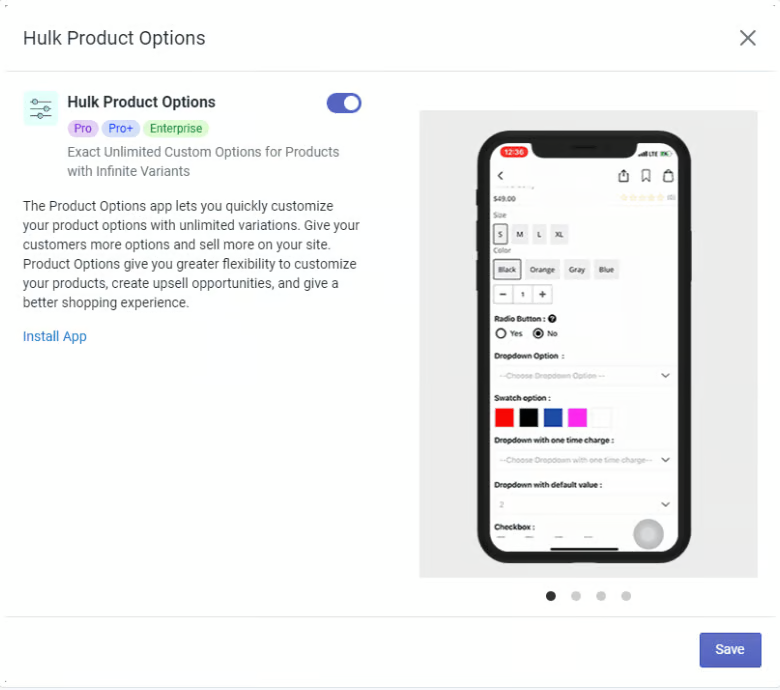Navigate to the Hulk Mobile App Builder App > Settings > Integrations >Hulk Product Options, and Enable the Integration.