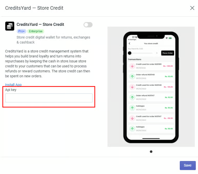 Navigate to the Hulk Mobile App Builder App > Settings > Integrations > Paste the created API token from the CreditsYard, and Enable the Integration.