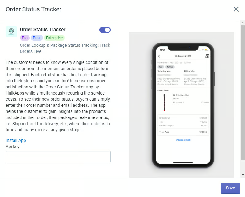 Navigate to the Hulk Mobile App Builder App > Settings > Integrations > Paste the created API token from the Order Tracker app backend, and Enable the Integration.
