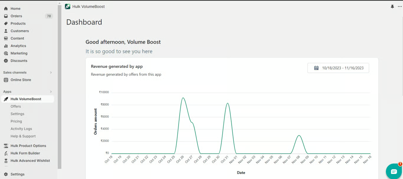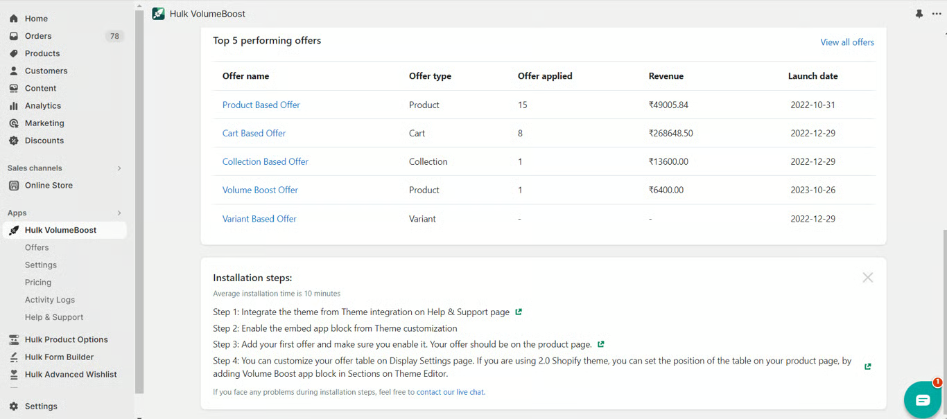 The app dashboard provides a concise, professional summary of your top 5 performing offers since their launch, detailing the revenue they've generated in your Shopify store. This feature offers a quick yet insightful overview of your most successful promotions, aiding in strategic decision-making for optimized marketing performance.