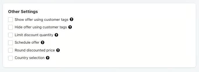 Add customer tags to allow specific customers only to view the offer, hide offers for specific customers, limit quantity discount, schedule offer, round-off discounted price, and country selection to enable the offer in specific countries only.