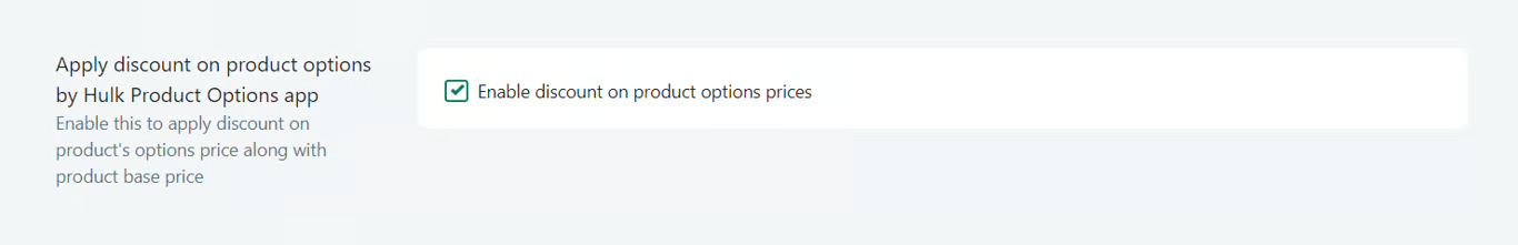 Navigate to our app>> Settings>>Advanced Settings>>Apply discount on product options by Hulk Product Options app and enable it and Save the settings.