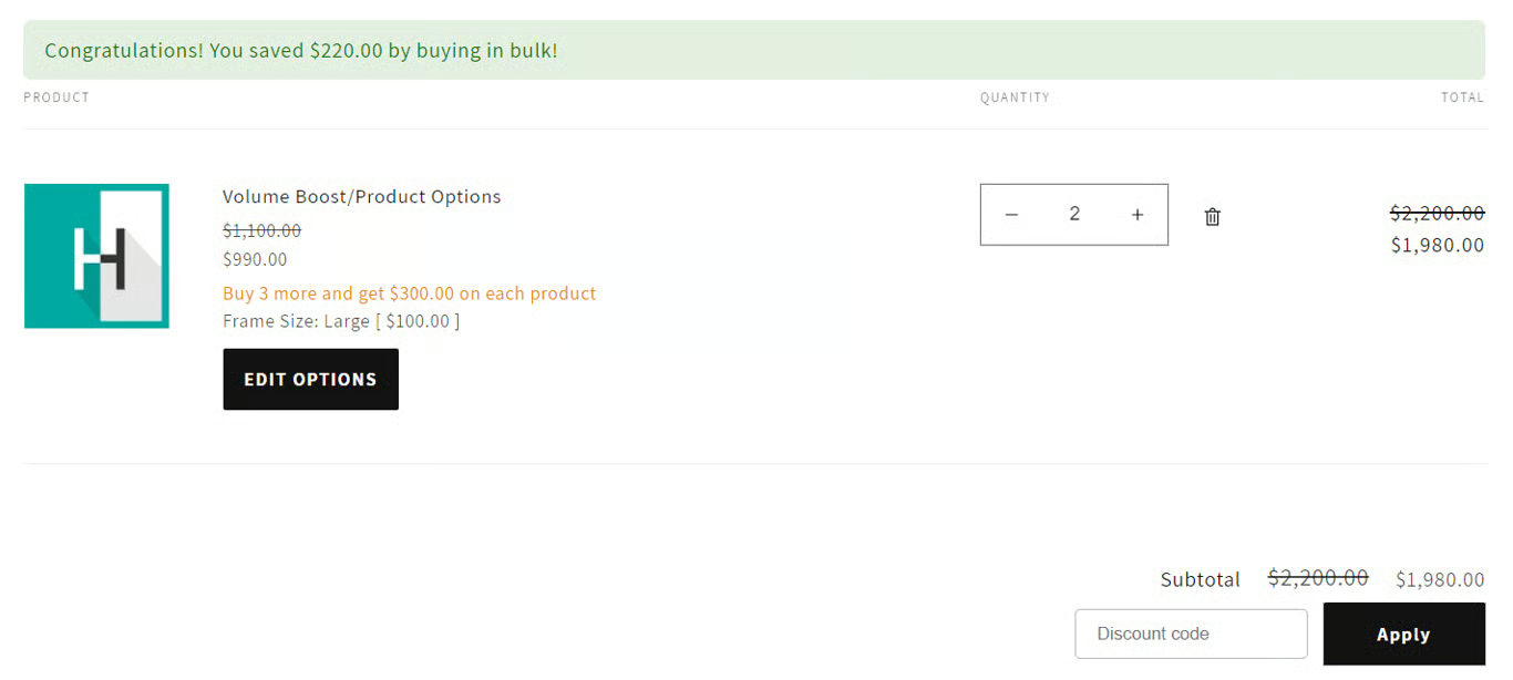 Without Hulk Options IntegrationIn the above example, a 10% discount was applied to the product's base price of $1000. This resulted in a deduction of $100 from the original price, bringing it down to $900. After adding the product option price of $100, the total came back to $1000. When two quantities of the products were purchased, the final total amounted to $2000.