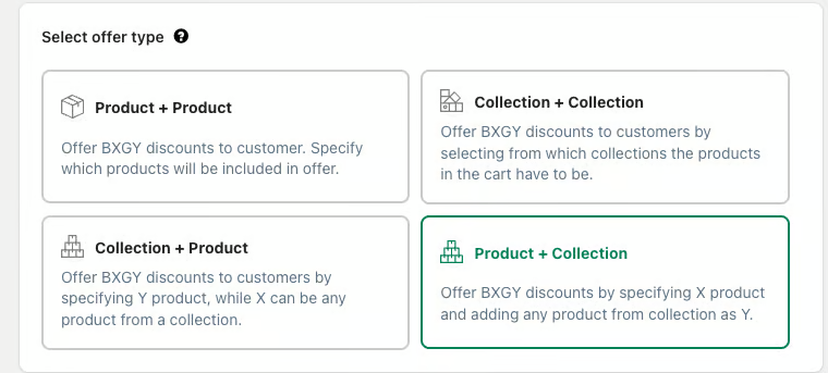 Choose the combination that suits your needs. For example, if you want to create an offer where your customer buys one product and gets any other product from a specific collection for free or discounted, select the "Product + Collection" offer.