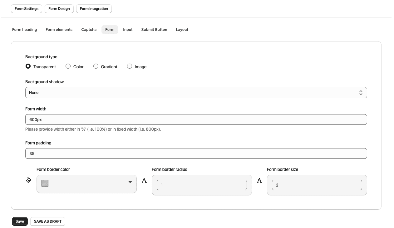 5. Under “Form” you can design the "Background Type & Shadow" along with "Form Padding", "Form Width" & "Form Border" options.