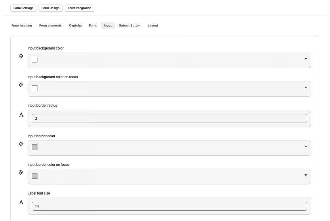 6. Under “Input”, you can customize the appearance of the input fields on the form as well as text size, color, and font of the “Label Text” and “Input Text”