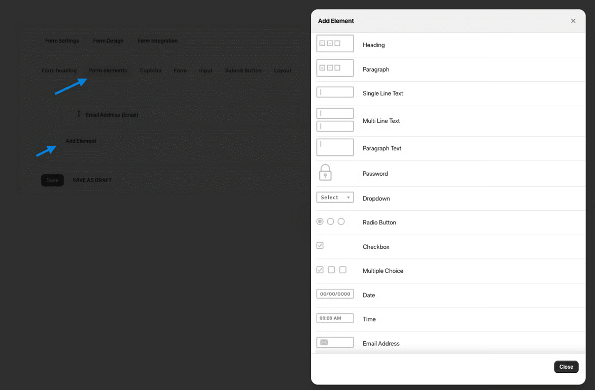 Additionally, changing the order of the elements can be achieved by simply dragging the element in question with the use of arrows: