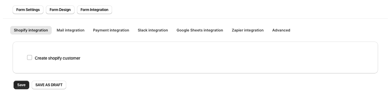 1. Under “Shopify Integration” in "Form Integration", you can toggle "Create Shopify Customer" to create a new user for the store.