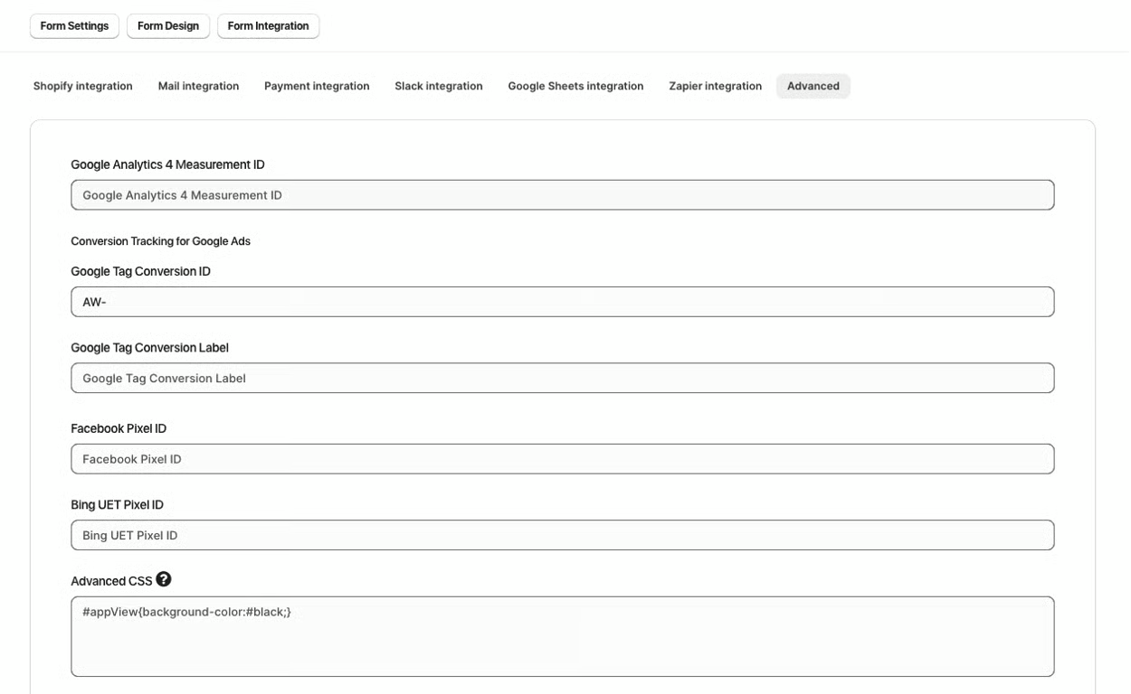 2. The “Advanced” section allows you to enter a “Google Analytics Measurement ID” as well as implement more custom designs using “Advanced CSS” and “Advanced JS”