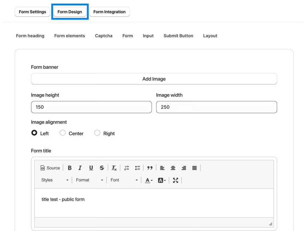 Go to the Form Design section & configure the appearance of the form using the given parameters.