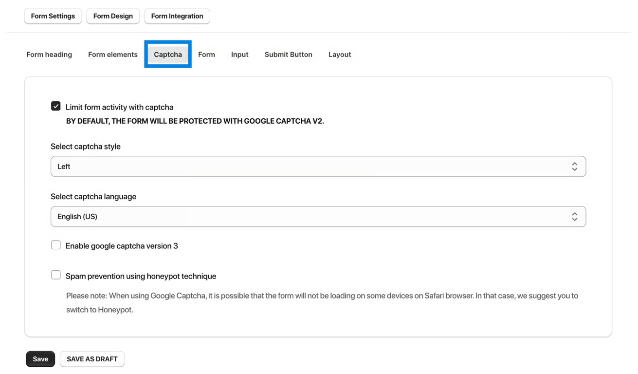 Google Captcha validates human users and protects any form submission from bots. You can also enable Captcha and select its position in your form. All you need to do is enable this feature in the Form Design.