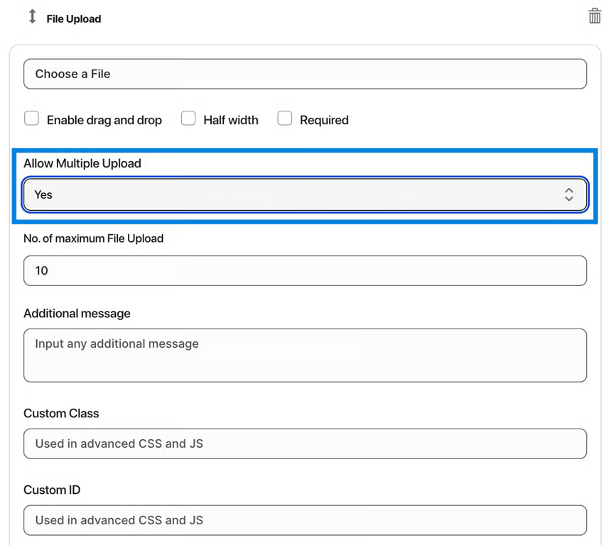 Our app supports files in all formats at once. You just need to select “Yes” to allow multiple file uploads. You might also place a restriction on the maximum number of files to be uploaded. Although, there is no limitation on the file upload storage. The app stores all the files within our AWS memory.