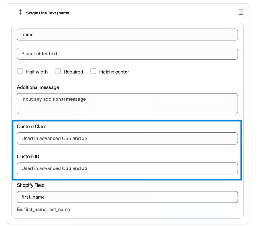 Add a custom ID and class properties for each field. An ID can be used to identify one element. Whereas, a class property is used to target all fields of the same type.