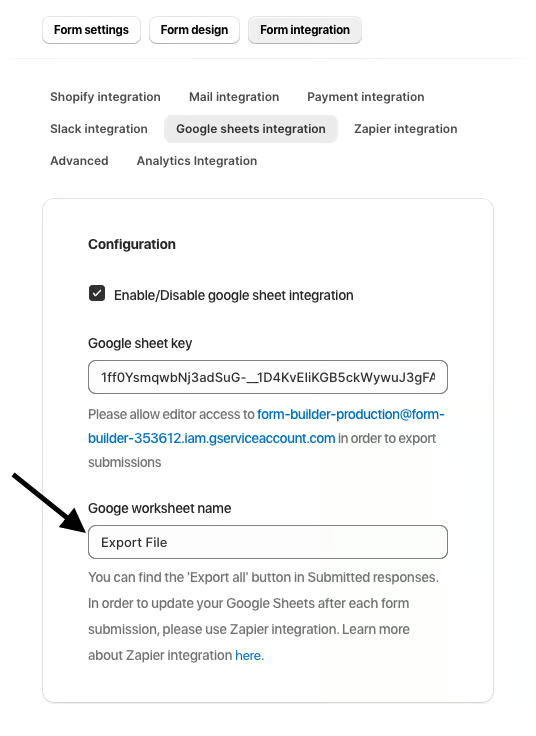 Provide the name of the worksheet where you want the form submissions to be stored (Google Worksheet name and file tab name fields).