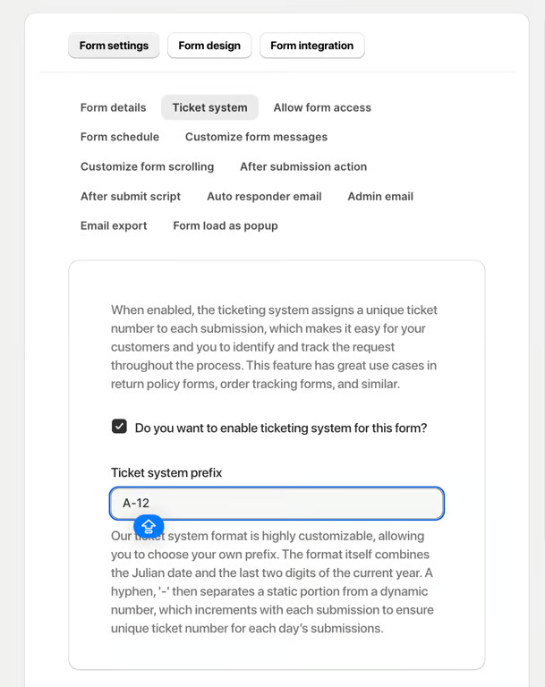 The Ticket System allows you to assign a unique ticket number to each form submission. This makes it easier for both you and your customers to identify, reference, and track requests throughout the process.