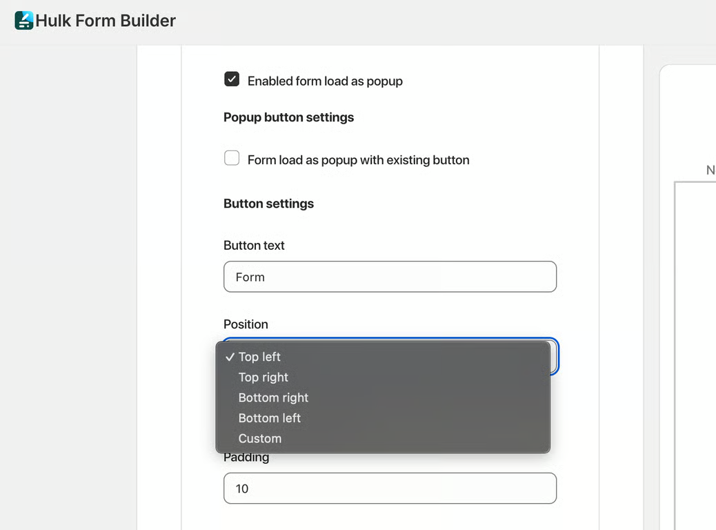 Select where you want the form button to be among the 4 position options or place it anywhere in the page by choosing Custom placement option. You can place the form as a popup anywhere in the page by going to the storefront, clicking Inspect and then copying the class id into the Class ID field.