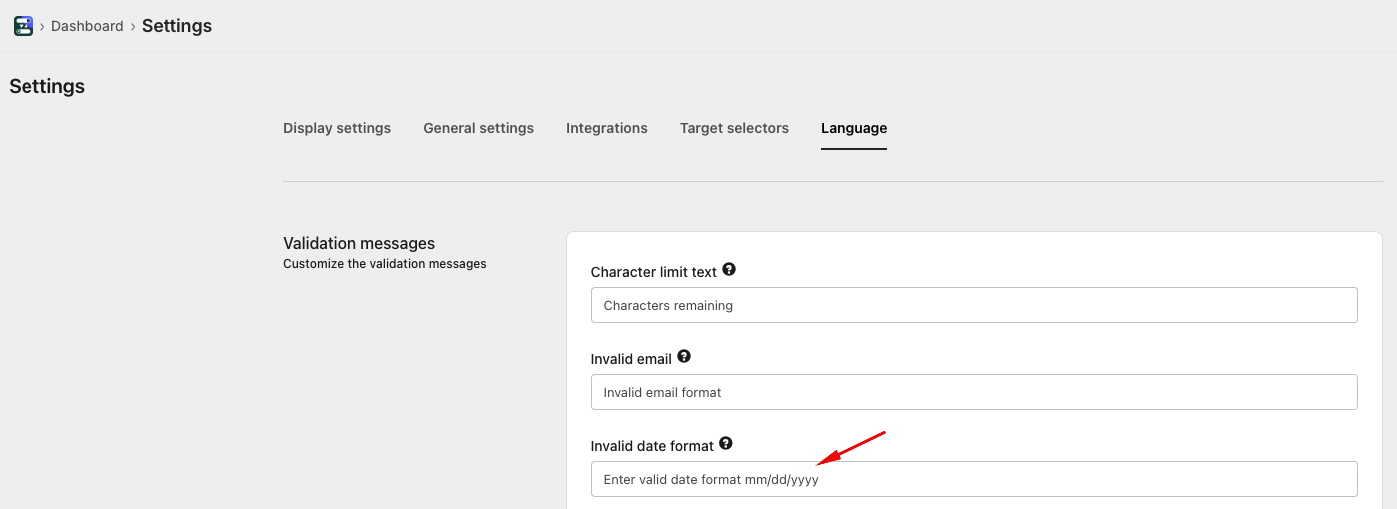 Go to Settings >> Language >> Validation messages to update the “Invalid date format” text.