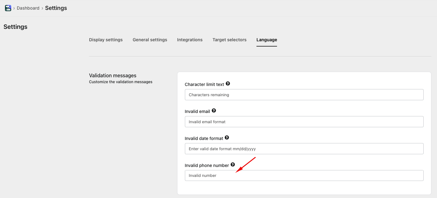 Go to Settings >> Language >> Validation messages to update the “Invalid number” text.