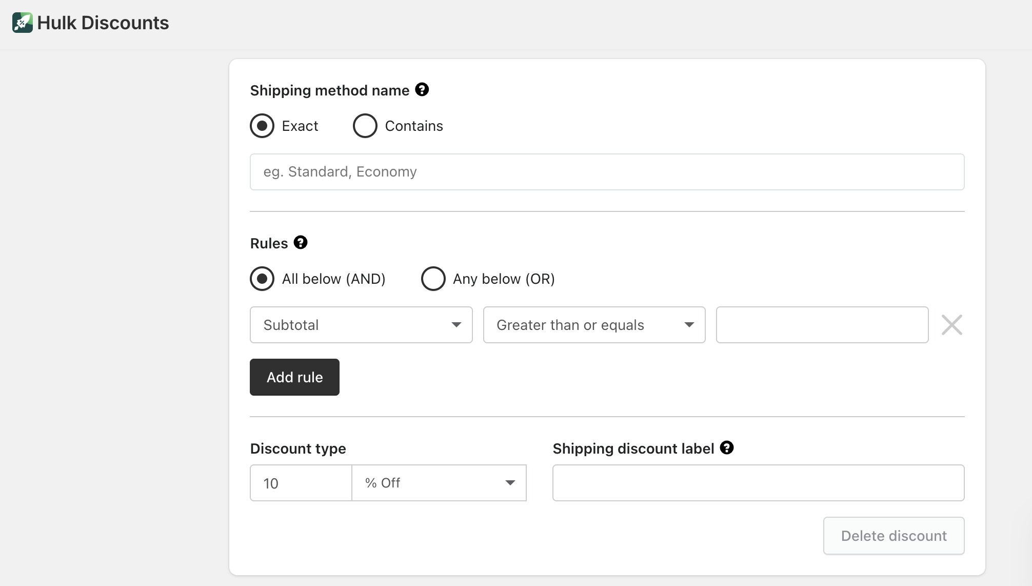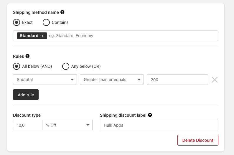 Contains – Applies the discount if the shipping method name contains the entered text