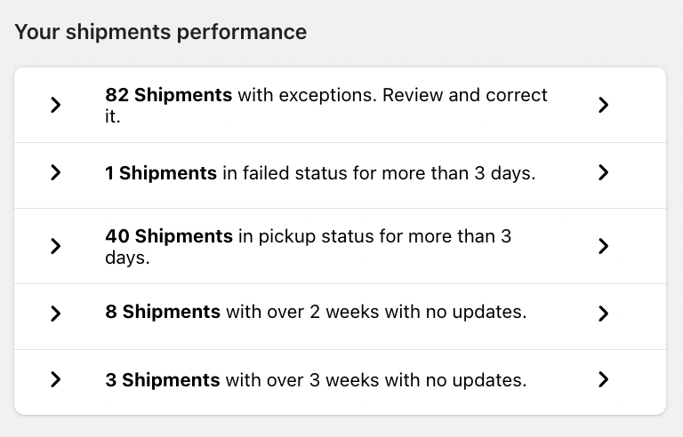 Clicking on any item will take you to the relevant shipment list for further action.