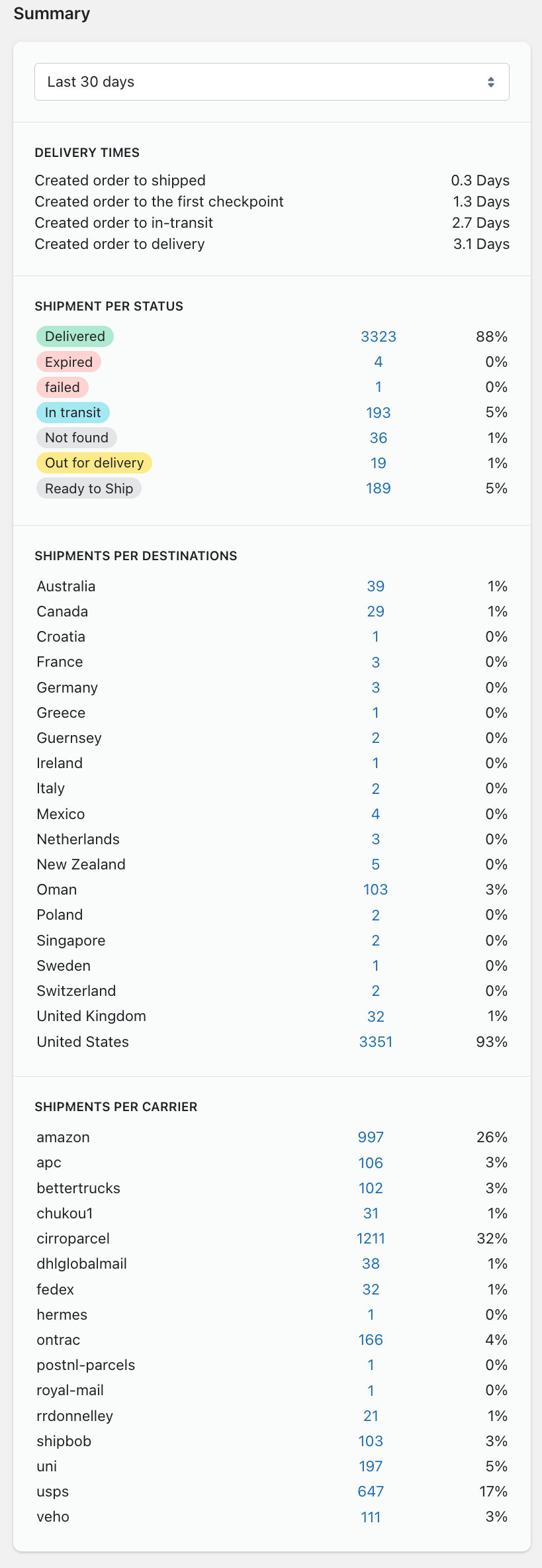 The Summary panel provides a deeper breakdown of shipment performance. You can filter the data by date range (e.g., Last 30 Days).