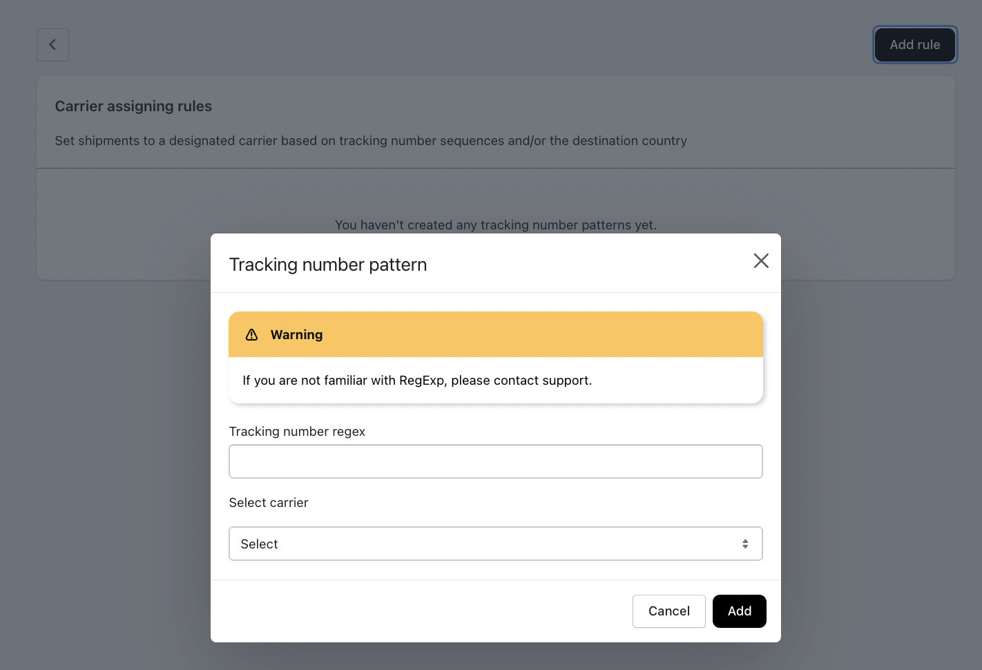 The Carrier Assigning Rules feature allows you to automatically assign shipments to a specific carrier based on tracking number patterns and/or destination country.